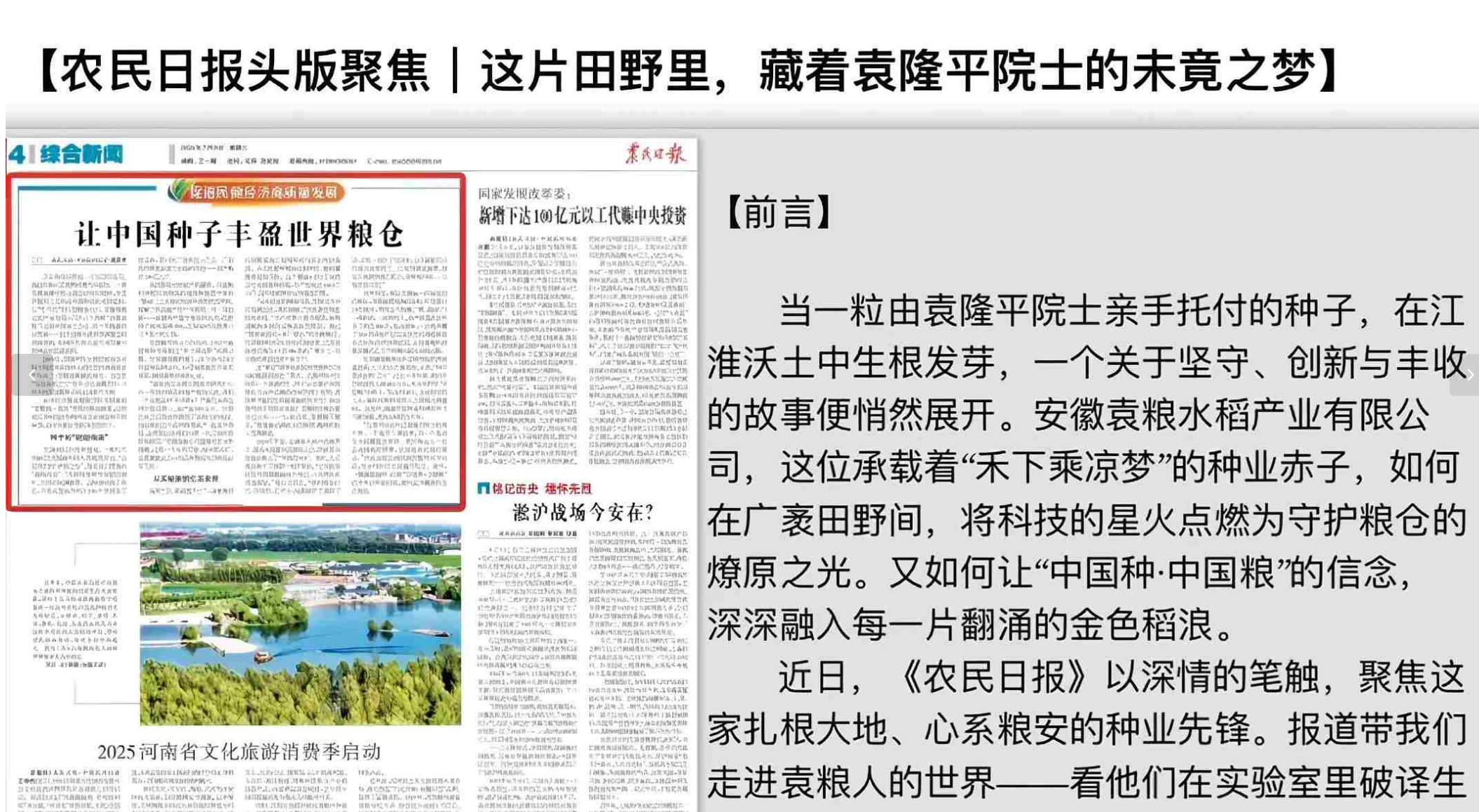 安徽袁糧集團(tuán)是由安徽袁糧水稻產(chǎn)業(yè)有限公司(以下簡(jiǎn)稱(chēng)“安徽袁糧”)和恒基利馬格蘭種業(yè)有限公司(以下簡(jiǎn)稱(chēng)“恒基利馬格蘭”)組成的、從事雜交玉米和雜交水稻研發(fā)、生產(chǎn)、銷(xiāo)售等業(yè)務(wù)的國(guó)家高新技術(shù)企業(yè)。其中雜交玉米和雜交水稻板塊均是“育繁推一體化”種子企業(yè)。近十年來(lái),集團(tuán)守正創(chuàng)新、拼搏進(jìn)取,雜交玉米種子業(yè)務(wù)位居全國(guó)前列,雜交水稻種子業(yè)務(wù)牢牢占據(jù)安徽省頭部方陣,探索出了一條“技術(shù)強(qiáng)、資源多、品質(zhì)好、服務(wù)優(yōu)”的集團(tuán)特色發(fā)展之路。